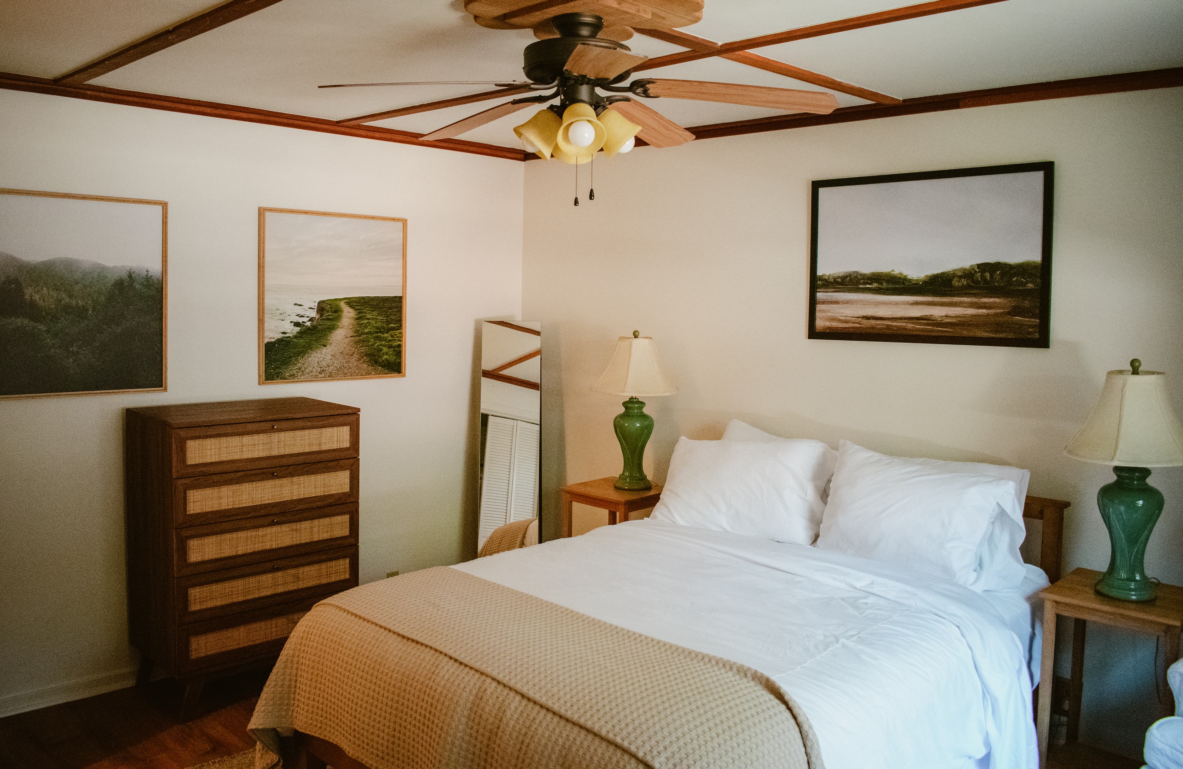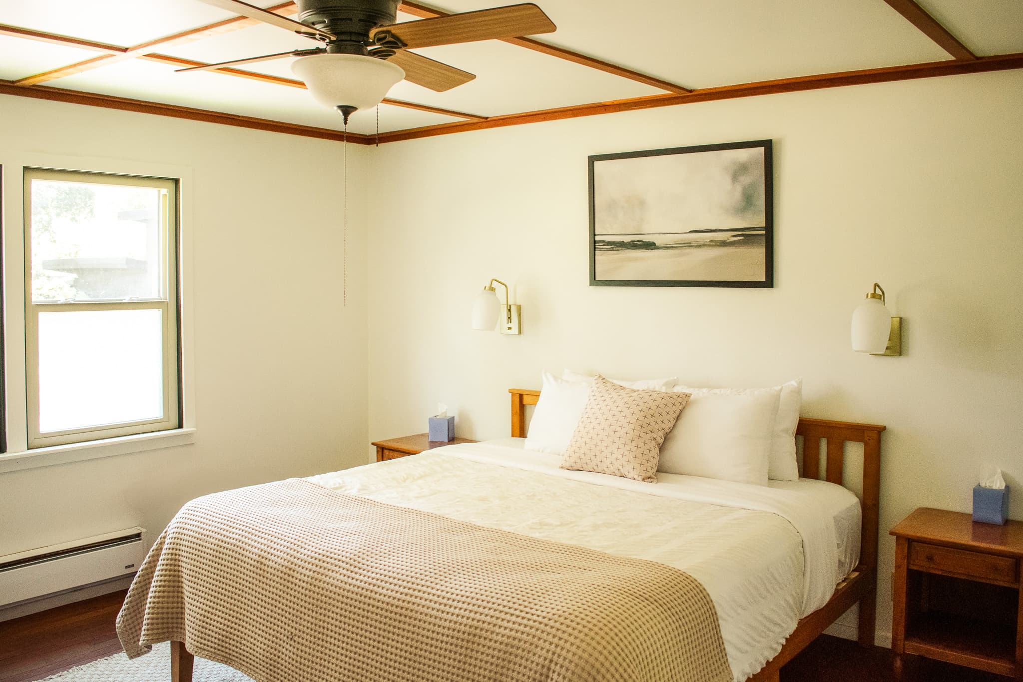 Our Classic Queen is perfect for couples or solo travelers looking for a getaway in wine country. Our hotel room places you in the heart of the Anderson Valley where you can recover with a restful night of sleep on a comfortable queen bed. Enjoy a glass of local wine or a cup of freshly brewed coffee by the seating area, or take in some fresh air while lounging in your semi-private mini patio. Each room features an ensuite bathroom with a shower, seating area with a small table, and outdoor lounging area. Complimentary Wi-Fi* and coffee is included. Limit of 2 guests. We currently do not have air conditioning, but all units have a ceiling fan and we also provide a window fan for your comfort.